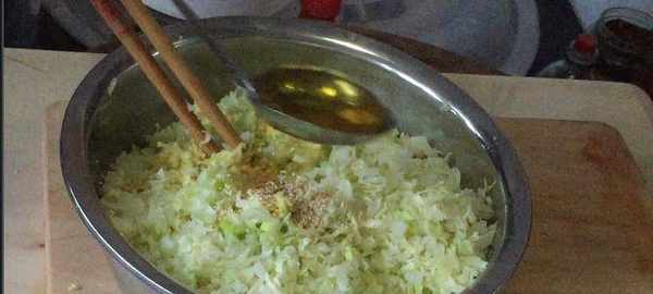 現在我們進行調餡的第二步:白菜餡裡加一勺花生油,鎖住白菜的水份,白菜餡不出水,油放少瞭可不行啊,就是花生起鎖水的作用,再加兩克鹽,小量生抽提鮮,攪拌均勻就可以瞭