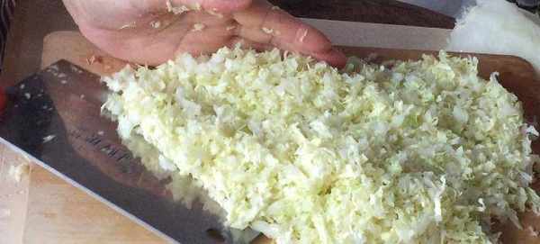 白菜洗凈後,切碎,要葉不要幫,剁白菜時,一定不要剁的太碎,太碎白菜的營養就會順著湯汁流失,如圖這樣,不用擠,直接放肉餡裡,我們再切的點蔥花,切碎放白菜一起,薑我們也切成沫,剁碎一點,白菜跟薑是好朋友,有薑一起,白菜更鮮美。