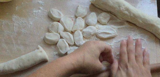 我們把面排氣,揉勻後搓成長條,用刀切成大小均勻的劑子,搟成餃子皮