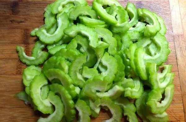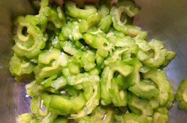 1、苦瓜清洗幹凈,切掉頭尾,再對半切開,把苦瓜裡面的瓤掏幹凈,再切成片。