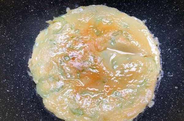 6、熱鍋放入適量油,燒至六成熱,倒入一勺粉漿,連苦瓜一起倒入,再用勺子弄平,小火煎至金黃。