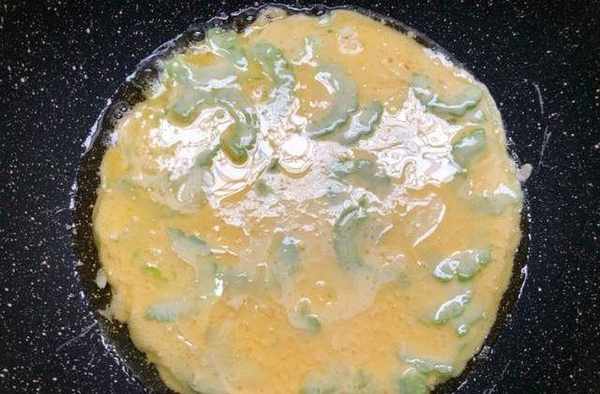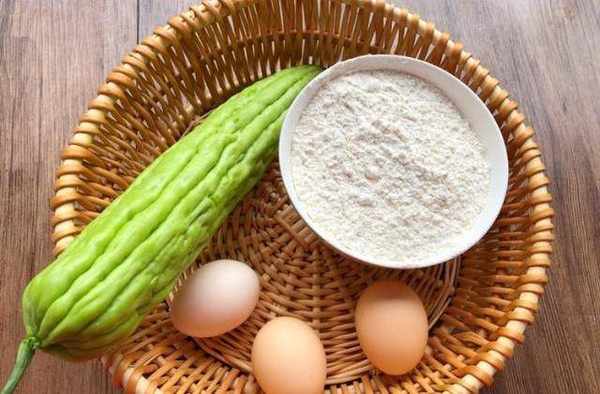 食材:苦瓜1根,雞蛋3個,面粉150克,水180ml,鹽適量,雞精適量。