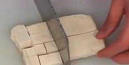 首先將洗凈的海綿對半切開,切成條狀和小方塊,將洗凈的豆腐切成小方塊備用。