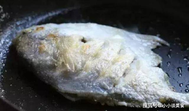 第三步:鍋內倒入適量油,燒熱至70~80度,將裹好淀粉的鯧魚放入,中小火慢慢煎至魚兩面金黃,把魚拿出來。
