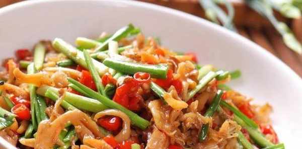 第三步,鍋中油燒熱,爆香薑、蒜、辣椒和青蒜,然後快速翻炒貽貝肉,加鹽、生抽、雞精和糖調味,翻炒均勻,然後即可將其從鍋中取出。