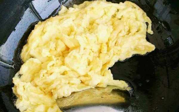 第四步:鍋中放油燒熱,油燒開後倒入蛋液,待蛋液成型熟後,搗碎盛出備用。