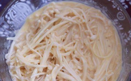 第三步,如果覺得太稠,可以加入一半的蛋液打成稠度適中的奶油,然後將處理好的金針菇放入奶油中,保證能均勻覆蓋奶油;