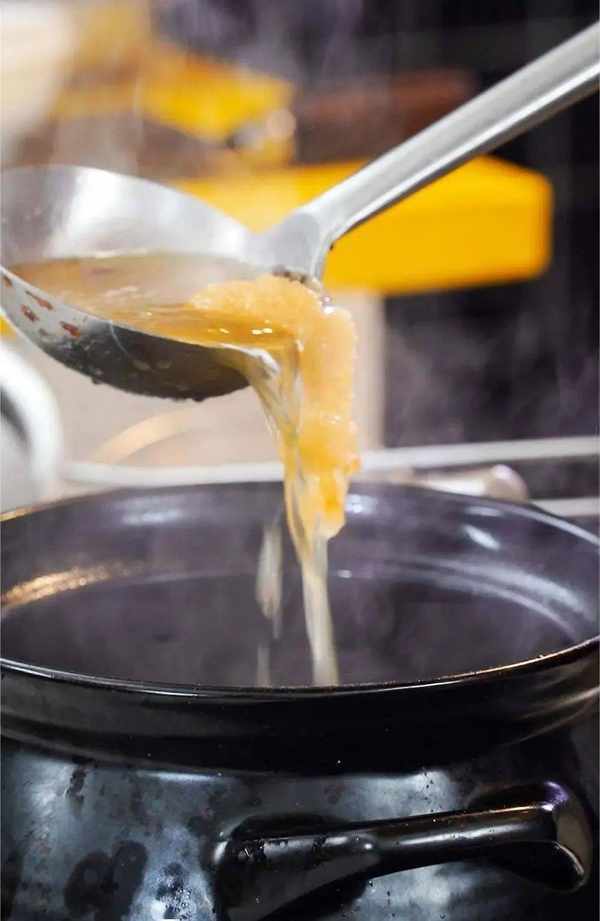 如果是玻璃或大理石桌子,需要在上面墊一塊木板,防止降溫太快導致砂鍋裂開。稍微等上幾分鐘,打開蓋子就可以盛湯品嘗瞭。