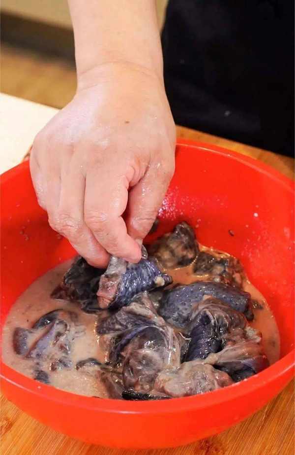 倒入適量的清水用手攪拌一下,使面溶解在水中。然後用手仔細清洗雞塊,這樣能把雞塊表面的油污清洗幹凈。