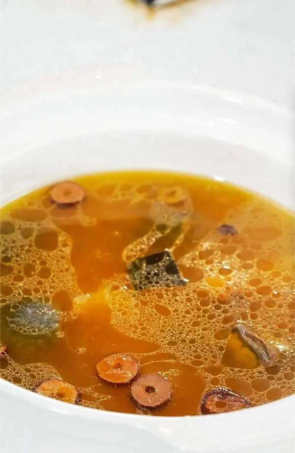 3、想讓湯變得清亮一些,在燉煮30分鐘後打開蓋子用勺子稍微盛出一些油倒掉即可。