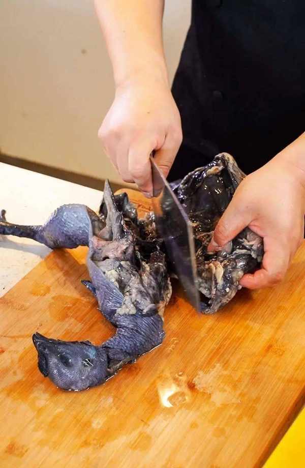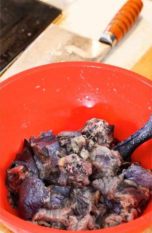 整隻烏雞用開水燙去毛,切開肚子掏掉裡面的內臟。用清水沖洗一下然後放在菜板上切成小塊,這樣利於燉煮入味。