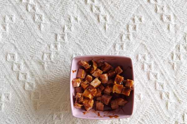 步驟2、火腿丁拌上2勺黑椒醬。拌勻。