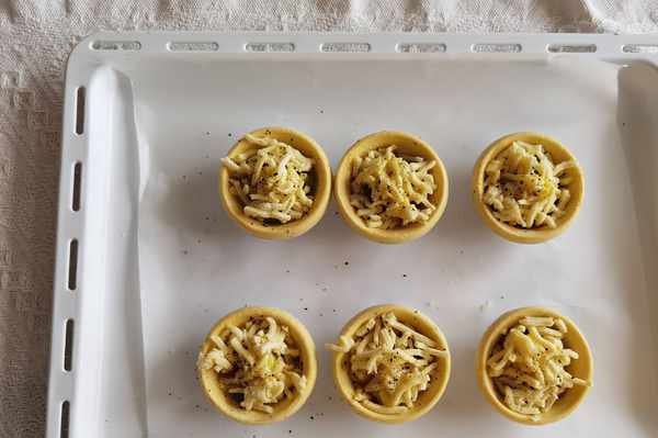 步驟6、雞蛋一隻攪打均勻,每隻蛋撻中舀1-2勺。磨上適量黑胡椒粉。