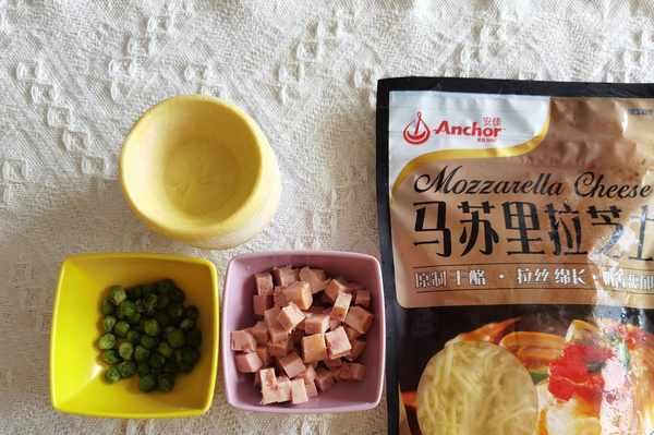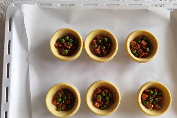 步驟1、材料準備。豌豆清洗幹凈備用,無需焯水。火腿切丁。撻皮提前十分鐘取出回溫。