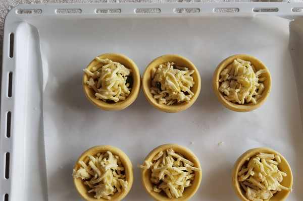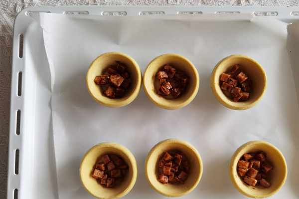 步驟3、烤箱預熱上下210度。烤盤墊上油紙,回溫好的蛋撻放入。把拌好的火腿丁均勻舀入撻皮底部。