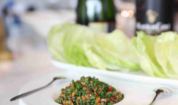 海味瓜子肉生菜包要裹著生菜葉吃,在動手間體驗樂趣和美味。