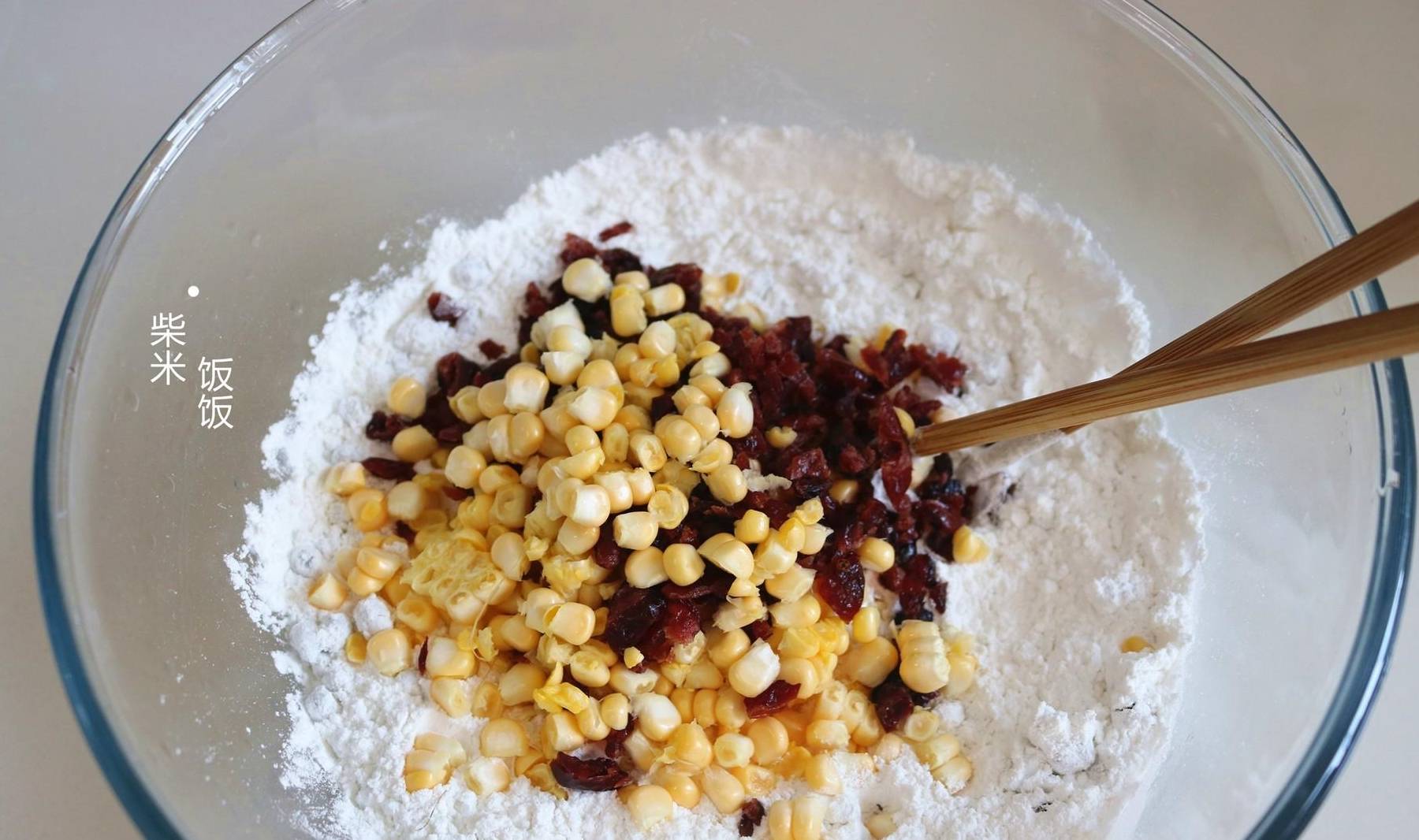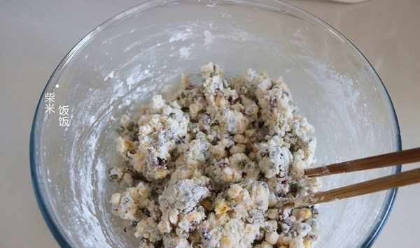 4,提前把鮮玉米從玉米棒上切下來,蔓越莓幹切碎,一起倒入糯米粉中拌勻。