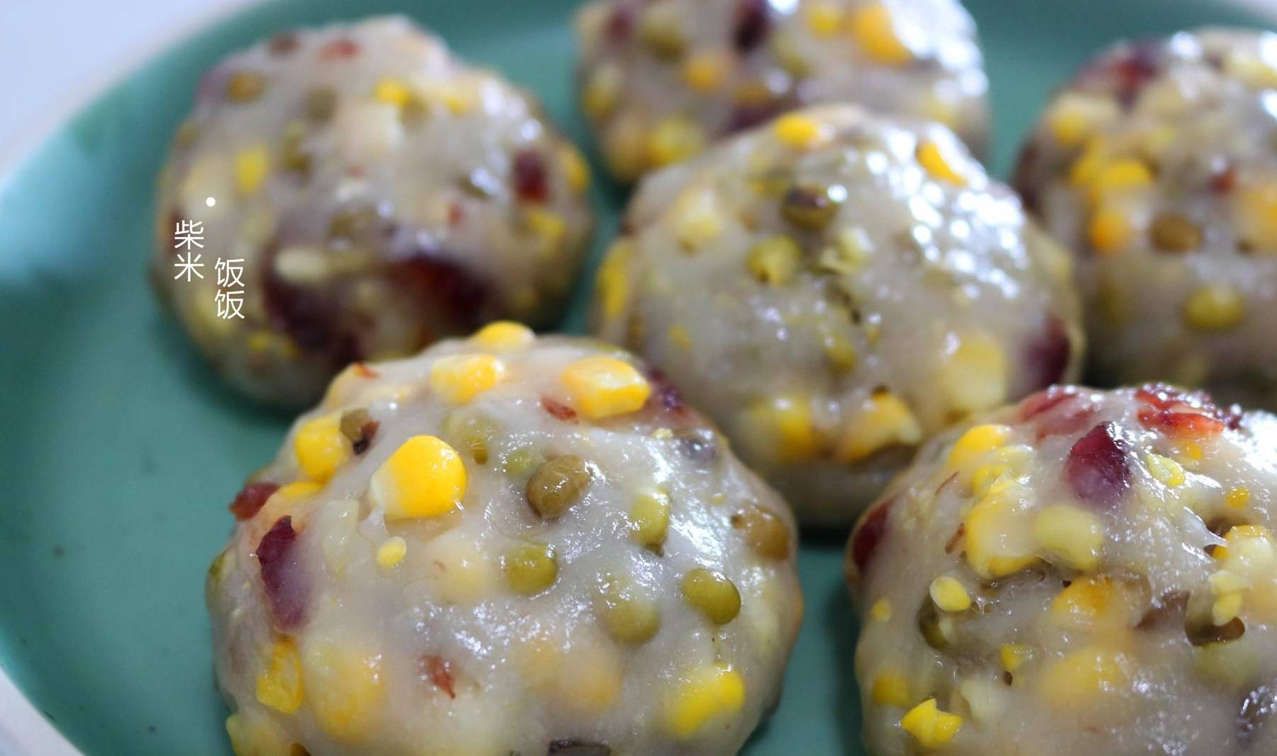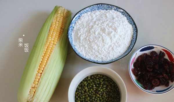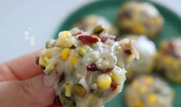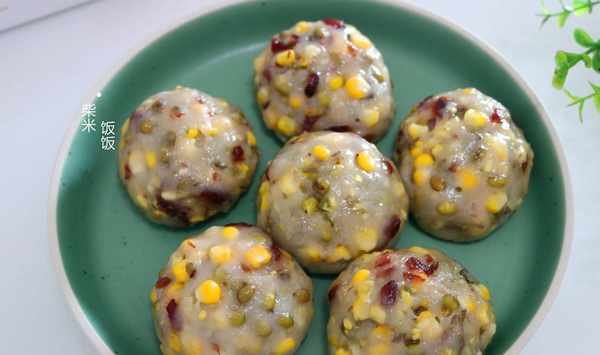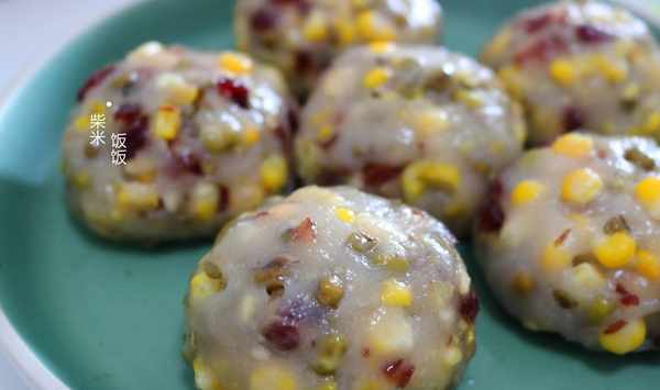 綠豆糯米團【食材】綠豆80克、鮮玉米一根、蔓越莓30克、糯米粉200克、白糖20克