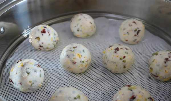 這款糯米團用的是糯米粉,還搭配瞭鮮嫩的玉米粒和酸甜的蔓越莓幹,口感非常豐富。做法也非常簡單,把所有的食材放在一起,拌一拌,團一團,上鍋蒸熟就好。無油少糖,健康又好吃。
