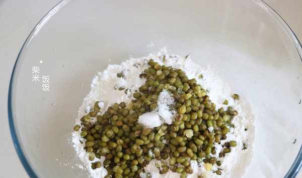3,大碗中倒入200克糯米粉,將煮熟的綠豆倒進來,再加20克左右的白糖增加甜味,用筷子拌勻。
