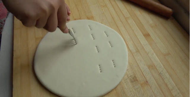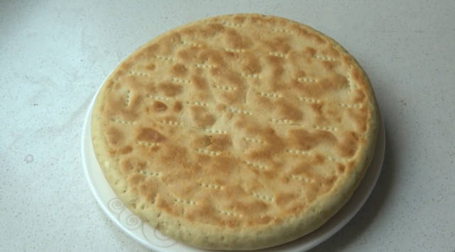 面團餳好後,裡面呈蜂窩狀就是餳好瞭。面餳好後,把它揉一下,然後分成4份。取一份把它搟一下,案板上搟成3cm的厚面皮。然後用叉子叉上孔,這樣烙的時候不容易鼓起來,也更容易熟。