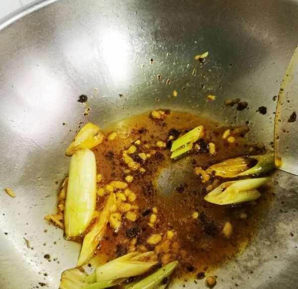 6、鍋中放油適量,放薑末、蔥段、少許火鍋底料,小火炒化。