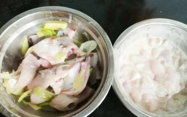 5、魚片中放料酒、加入蔥薑汁,放鹽適量,放胡椒粉抓上漿,再放雞蛋清抓勻,最後放淀粉鎖住水分,這樣魚片才嫩。魚骨放料酒,放鹽,再連同蔥薑汁中的薑片一起放入魚骨中,放胡椒粉。魚片和魚骨分別醃30分鐘。