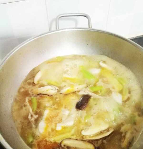 放入香菇和芹菜煮熟,放鹽調味,放胡椒粉,雞精,白糖少許。煮好後撈出放入大碗中。