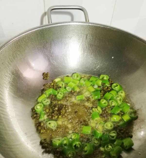 9、另起鍋,鍋燒熱,放適量的油,放入線椒和鮮花椒,開中小火煸香。