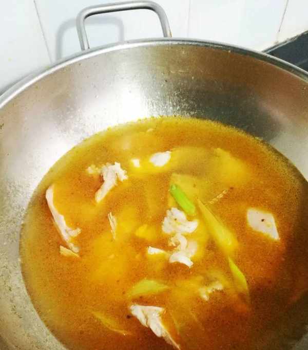8、開小火,把魚片一片一片地放入鍋中,然後靜置20秒,用筷子劃散,改大火煮1~2分鐘。魚片變色即可。