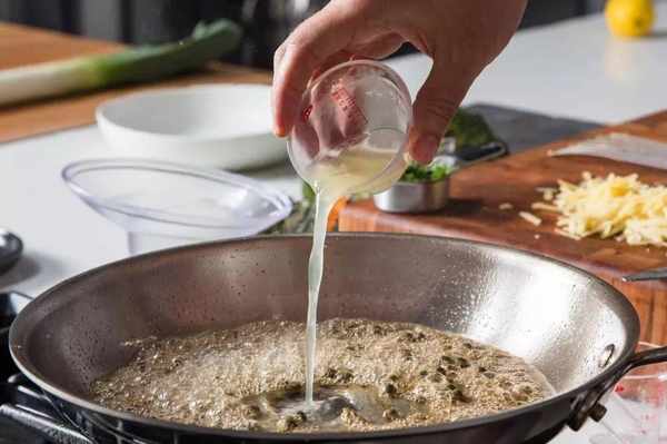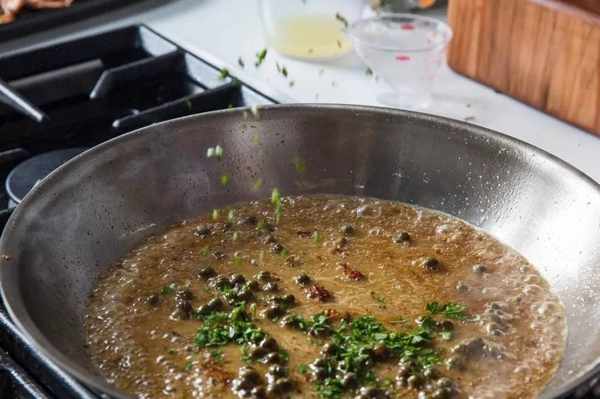 檸檬奶油醬炒軟殼蟹這些香脆、豐滿、咸咸的軟殼蟹隻需幾分鐘就可以煮熟,然後在上面澆上更快的檸檬棕色黃油鍋醬,配上刺山柑和歐芹。這是對新鮮軟殼蟹的純粹慶祝,沒有任何多餘的東西。