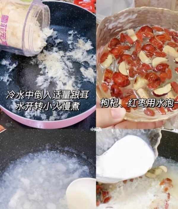 1.先倒出一點銀耳,冷水下鍋煮,千萬別倒多,這個銀耳煮完會變多,而且很出膠!5分就差不多瞭。