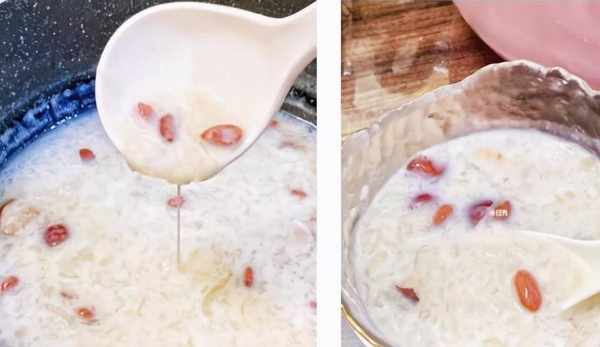 3.出膠後倒入紅棗、枸杞,然後煮3分鐘的時候倒入椰汁。