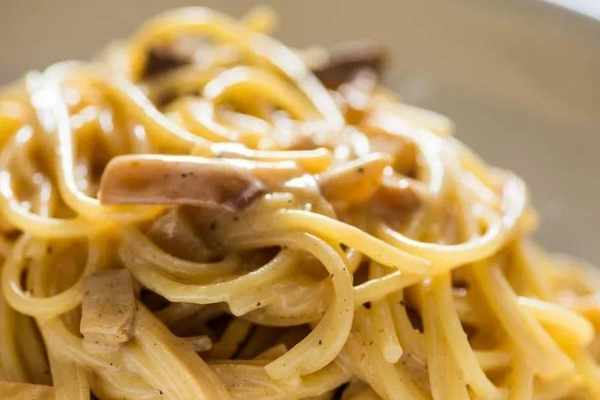 純素培根面食食譜純素版的意大利面碳酸鹽柔滑而豐富,點綴著肉塊,加上PecorinoRomano特有的乳酸味,但不含任何乳制品。