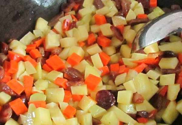 6、利用鍋內剩餘的食用油,再次燒熱以後,然後倒入土豆小火慢煎,直到土豆變成焦黃色,就可以倒入米飯裡面。