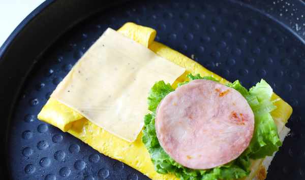 5.待蛋液凝固後整個都一起翻面,四邊折起來,分別放上芝士、生菜、火腿片