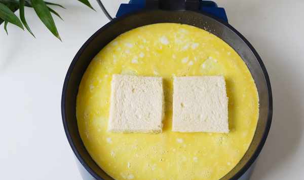 4.電餅鐺塗抹一層油,倒入蛋液,放上吐司