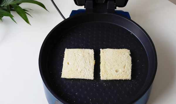 2.電餅鐺預熱,不用刷油,把吐司片烤的酥脆