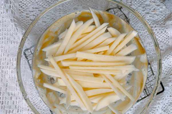 2、準備好的土豆去皮之後切成條狀,放在盤中清洗掉表面多餘的淀粉,土豆切好要及時烹飪,時間放久瞭容易變色氧化;