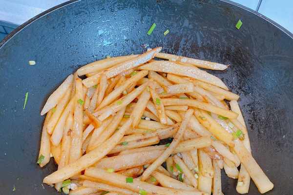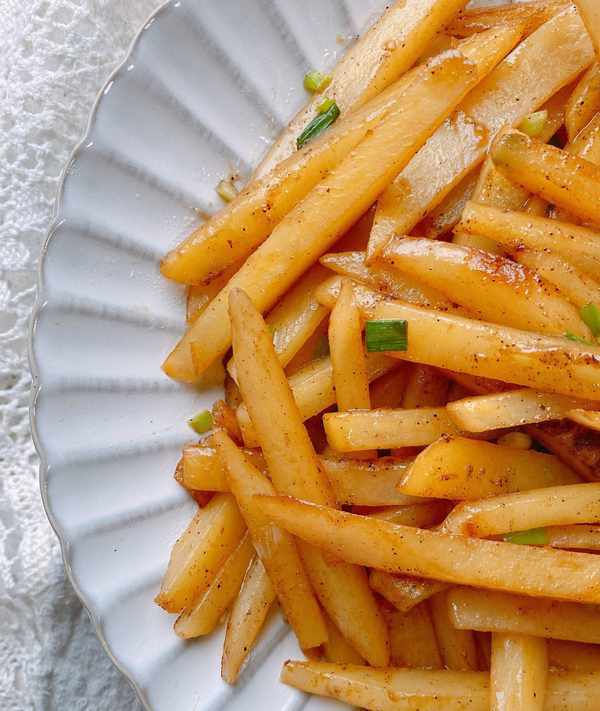 6、調料翻拌均勻之後,加少許蔥花,翻拌均勻就能出鍋瞭,好吃下飯的黑胡椒土豆條就做好瞭,非常下飯,好吃到舔盤;