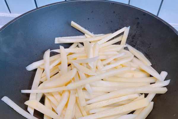 3、鍋燒熱,加入稍微多一點的食用油,炒土豆條的油要稍微多一點,加入清洗幹凈瀝幹水分的土豆條,先大火翻炒,把土豆條表面的水分炒幹;