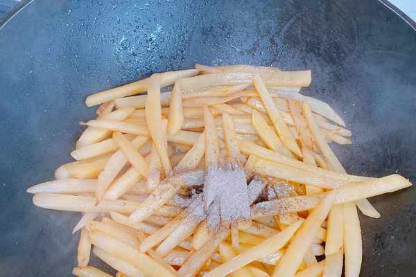 5、土豆條快要炒熟的時候開始調味,加少許食鹽、生抽、蠔油、黑胡椒粉,翻拌均勻,黑胡椒粉要放稍微多一點,味道會更好;