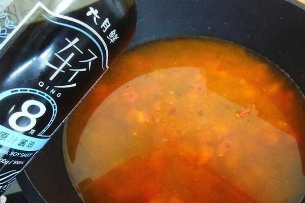 然後加水,放入約1勺醬油,再根據自己的口味少放一點點鹽。