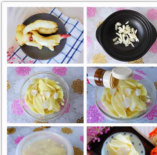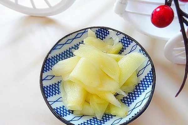 仔薑洗幹凈切薄片,不要厚瞭,再把幾瓣蒜切片,薑片和蒜片先用鹽拌勻醃制半小時。鹽不要多,微微有點咸度就可以。然後把醃制好的薑片蒜片一切放入保鮮碗或者密封瓶內,倒入清香米醋再放幾粒冰糖浸泡起來,三小時後就可以吃,冷藏後的口感極好。做一大碗能吃一周,早餐裡,來上幾片,開胃又下飯,還能促進身體健康,泡薑的醋汁,兌水直接喝或者拌菜都是非常美的。
