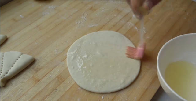 上面刷上油,把它折起來。靠近中間的位置把它捏一下,再用叉子插一下。插成荷葉的花紋,用勺子柄整理一下形狀。做好後,餳上10分鐘,涼水下鍋。開鍋後,蒸上15分鐘,就已經蒸好瞭。