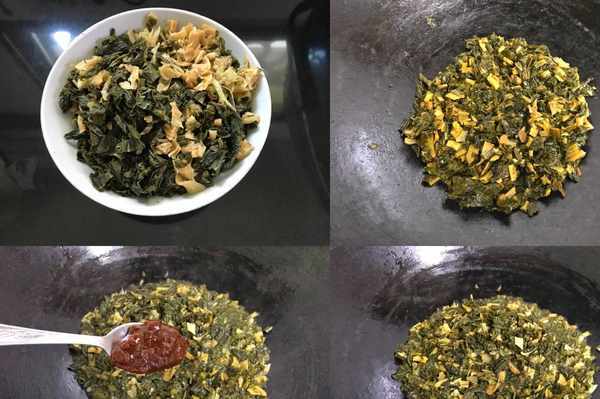 【材料】:繡花錦菜幹1把,黃豆辣醬1大勺,鹽少許,生抽1勺,油適量