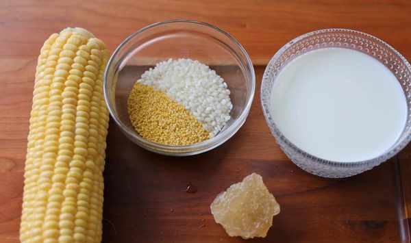 制作配料:甜玉米1根小米20克糯米20克冰糖1塊牛奶200Ml