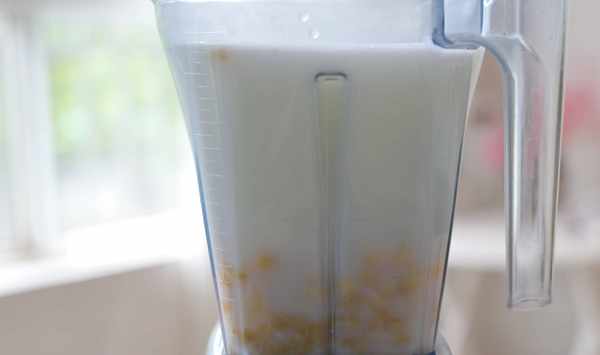 3、把玉米粒、牛奶、小米和糯米洗幹凈裝在料理杯裡,再加入700Ml的清水;如果喜歡奶香味更濃鬱的可以加點淡奶油進去;