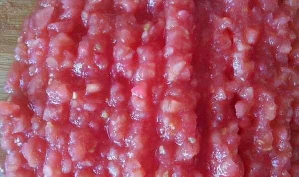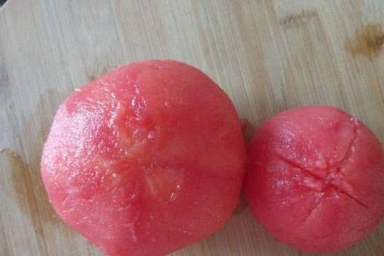 2.用幹凈的紗佈,把西紅柿的汁水和果肉分離出來。西紅柿的汁水用來和面粉,成光滑的面團,然後改成大小均勻的餃子皮。