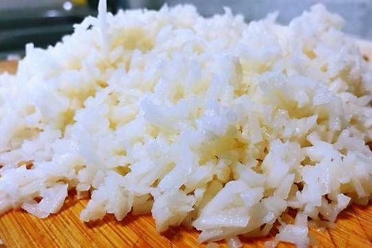 1.蓮藕一根將其去皮,然後從中間切開一分為二。用擦絲器擦成細絲,用刀剁成小塊就容易多啦!清洗好的紅尖椒同樣將其切成小丁放入碗中備用。